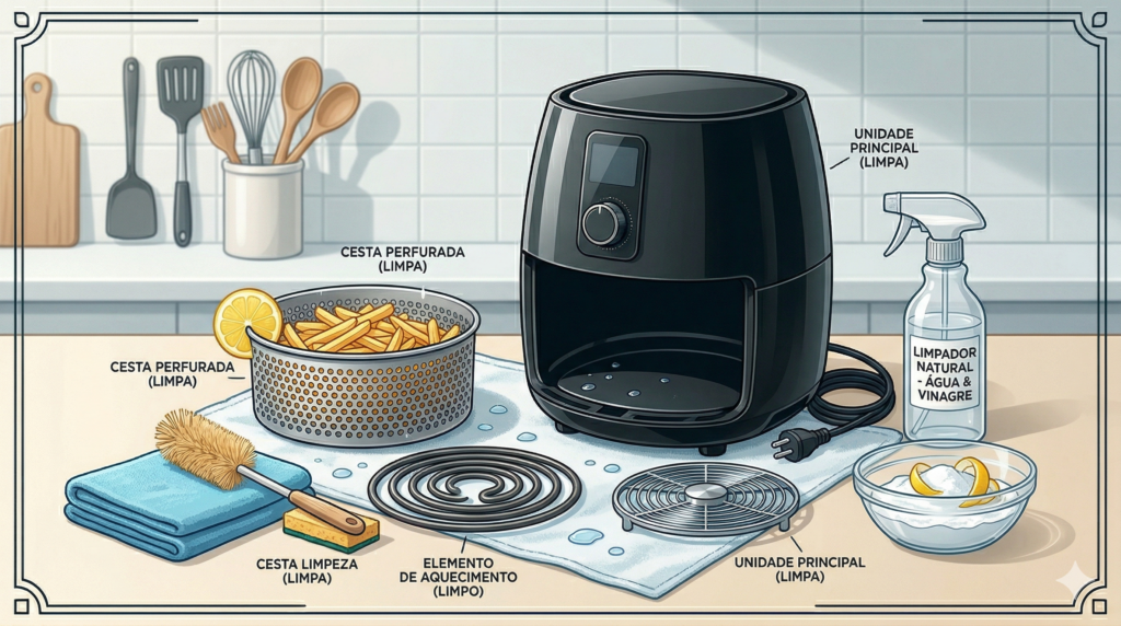 A limpeza correta da air fryer é o que garante a durabilidade do aparelho e — muito importante — a qualidade do sabor das suas receitas. Gordura acumulada queima nas próximas preparações e acrescenta um sabor amargo desagradável. A boa notícia: a limpeza é muito mais simples do que parece.